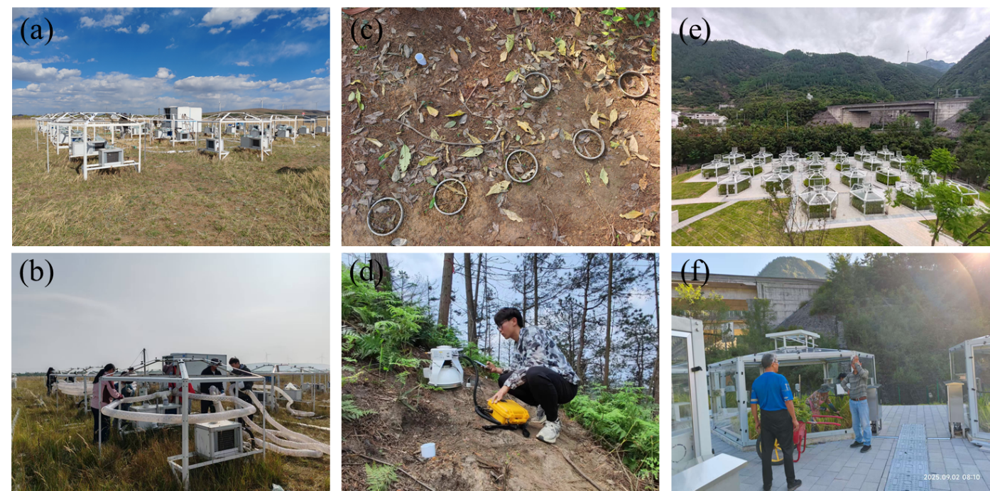 1. 目前开展的野外控制实验。(a-b)内蒙古春、秋季霜冻实验,主要观测植物物候、植被群落组成、生态系统碳通量等;(c-d)重庆缙云山火烧迹地碳排放实验,主要观测土壤呼吸的各组分;(e-f)重庆金佛山高温热浪水稻田实验,主要观测不同品种水稻对热浪的敏感性及碳分配。