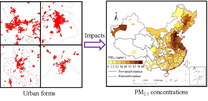 施开放副教授研究小组结合夜间灯光、NDVI等多源遥感数据,在提取我国250个地级市PM2.5浓度(尤其是非点源PM2.5排放)的基础上,构建了大尺度长时序的城市空间形态数据集,结合计量经济学模型探讨城市空间形态与PM2.5浓度的相关性。研究发现城市急剧扩张对我国中等城市和特大城市的PM2.5浓度具有显著的正向影响。城市空间形态的紧凑性有利于大城市PM2.5浓度的降低,而城市空间形态的不规则性对工业城市的PM2.5浓度的上升起着重要的作用。此外,与其他地区相比,紧凑而相连的城市空间形态更有利于减少北方地区的PM2.5浓度。