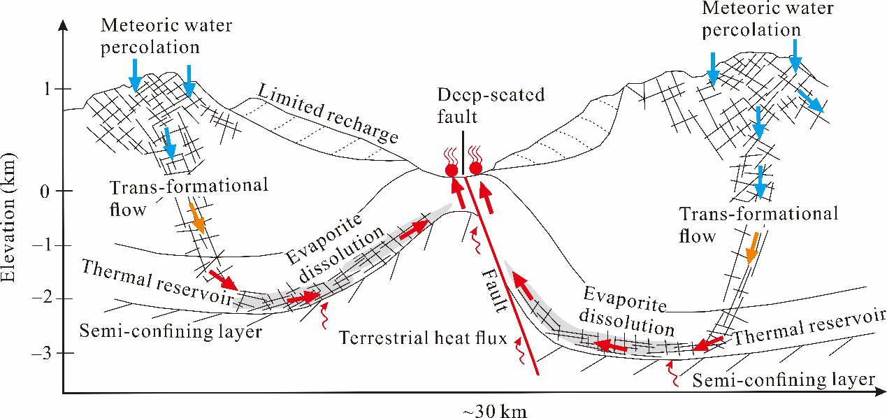 杨平恒课题组对面积近2万千米的***地区进行了多年野外调查,统计出该地区地热水排泄温度为19~54℃,主要出露在寒武系和奥陶系喀斯特地层,且与区域断层有着极为密切的关系。课题组采集了14个温泉、3口地热井和多条地表河的水样,在测试分析主要离子含量及相关稳定和放射性同位素的基础上,提出了***地区地热水资源形成的概念模型,认为古大气降水在重力驱动下,渗入地下深部被地温加热成为地热水,同时与围岩发生充分而又复杂的水岩作用,地热水在径流的过程遇到断裂做上升运动,形成自流温泉,从而形成与主城区明显有别的***断裂带型地热水流系统。该研究成果科学回答了基于重庆主城区“层状热储”思想的工作方法在***断裂带型地热水系统(带状热储)找水不甚理想的原因,也为未来***地区地热水资源的可持续开发利用奠定了坚实的理论基础。研究方法也可为世界其他地方非火山地热水系统的研究提供很好参考和借鉴。