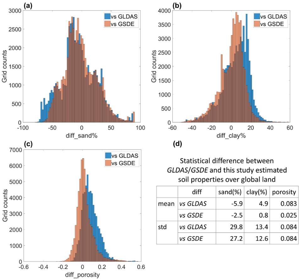图2 本研究与GSDE和GLDAS之间土壤质地和孔隙度差异在全球陆表格点范围内的频率分布直方图(a-c)及相应的统计数据(d)。