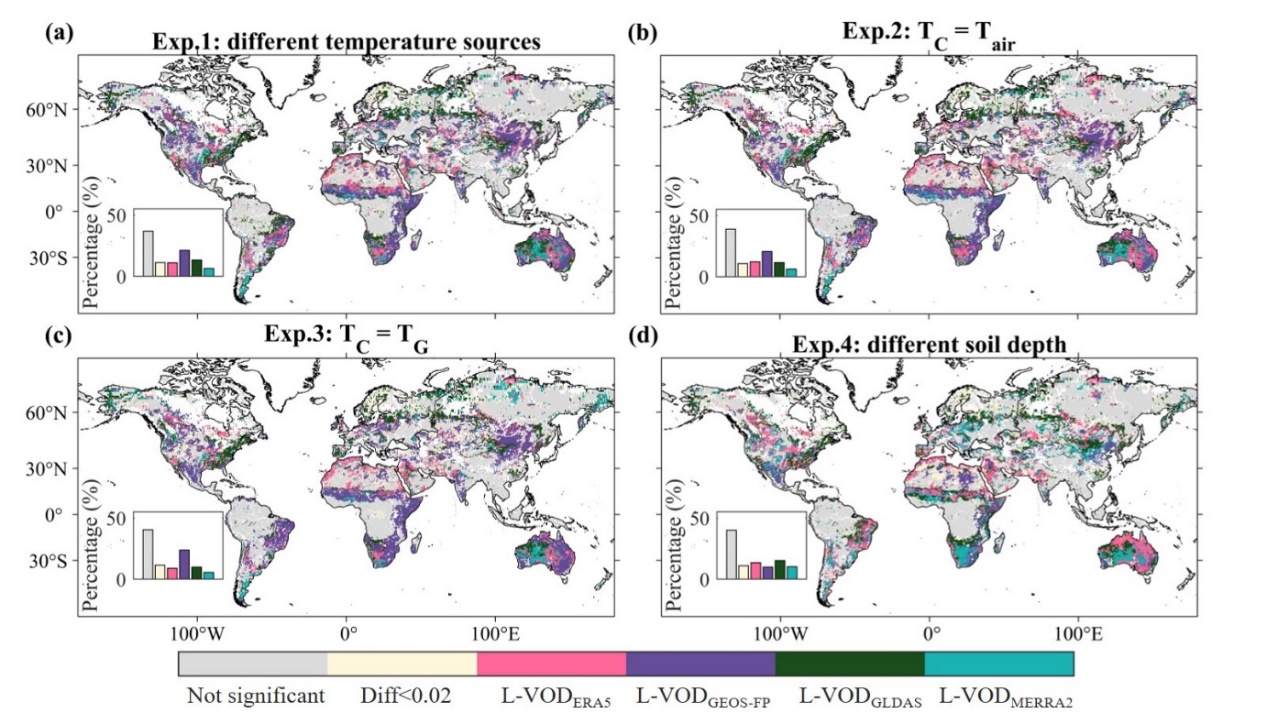 樊磊教授团队近日在国际遥感领域TOP期刊Remote Sensing of Environment(IF=13.5)上发表优化温度效应的全球土壤水分与VOD微波反演算法改进的最新成果。在环境监测和农业管理中,土壤水分(SM)和植被光学厚度(L-VOD)是重要的参数。通过τ-ω模型反演的SM和L-VOD产品的精度高度依赖于基于模型温度的有效温度输入。研究针对当前低频被动微波反演SM与VOD时,未充分考虑温度效应,导致反演精度低的问题,提出基于优化温度效应的微波反演算法,精度显著优于同类算法,其中在全球18%的地区提升了土壤水分和植被光学厚度反演精度。研究表明使用GLDAS温度产品输入的SM反演结果具有最佳性能,尤其是在森林区域(图1)。对不同温度输入对反演结果影响显示,利用浅层土壤温度获得的土壤有效温度比深层土壤温度反演的SM结果更准确。由此,作者提出利用GLDAS表皮温度和第1层(0-10 cm)和第2层(10-40 cm)的土壤温度来估算有效温度。改进后的有效温度输入反演的SM结果相较于原始SMAP-IB的总体TCA-R中值(0.76),提高到0.78,尤其是对森林覆盖区域提升显著。基于改进后有效温度反演的L-VOD结果相较于原始SMAP-IB的L-VOD结果也有较好的提升,并且基于GLDAS温度输入的L-VOD产品在不同温度情景下都优于原始SMAP-IB的L-VOD结果(图2)。