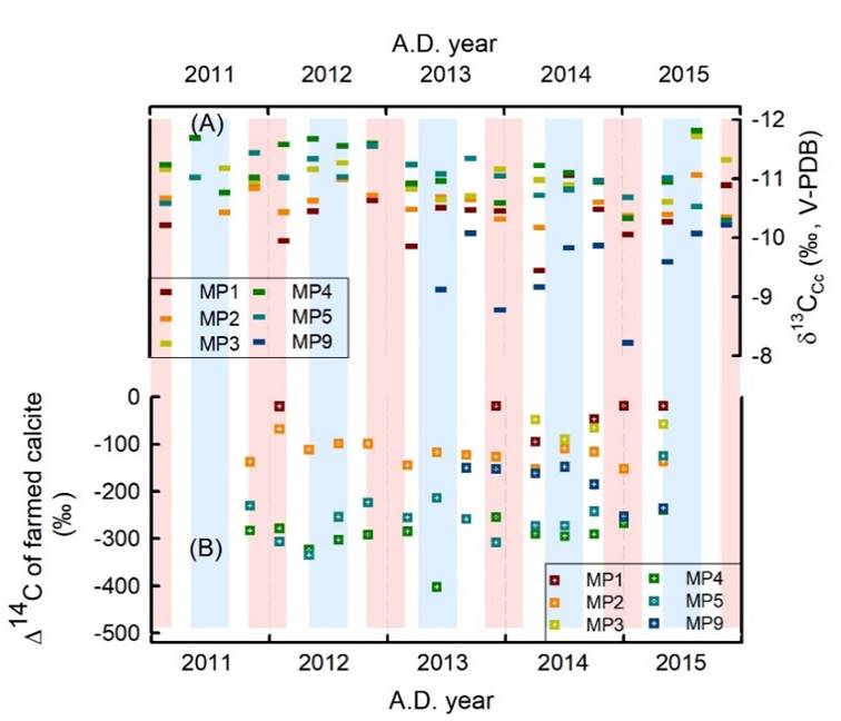δ13C是石笋古气候重建中的重要指标,记录了区域气候和地表环境信息,常被用于解释生态环境与气候演变之间的关系。根据2009-2019年在重庆市芙蓉洞开展的洞穴系统监测数据,包括大气环境(温度和降水量)、土壤有机质的“老碳”含量、洞内环境(温度、相对湿度和pCO2)、滴水滴率和洞穴次生碳酸钙沉积速率等,利用稳定同位素δ13C和Δ14C技术,分析芙蓉洞上覆表层岩溶系统的水文地质条件、洞穴环境和不同来源的“老碳”(多年有机质分解释放的CO2和基岩)对滴水和洞穴次生碳酸钙沉积物δ13C的影响。研究发现,对于同一个滴水点,当滴水速率<1滴/分时,洞穴滴水和相应沉积的洞穴次生碳酸钙δ13C出现明显偏正。Δ14C和δ13C的综合应用,可以有效区分滴水的碳源,其中不同来源的“老碳”是影响滴水δ13C的重要因素,当滴水中含有较多土壤多年有机质分解释放的“老碳”时,滴水和次生碳酸钙δ13C偏轻;当滴水中来自于基岩的“老碳”占主导时,滴水和次生碳酸钙δ13C偏重。滴水和沉积物中的“老碳”含量均具有稳定性,但滴水中的“老碳”含量低于洞穴次生碳酸钙沉积物,说明“老碳”可以累积于沉积物中,导致同一个洞穴不同石笋δ13C产生明显差异。本研究综合应用稳定碳同位素和放射性碳同位素探索不同碳源对石笋δ13C的影响,“双碳”结合有助于深入解译石笋δ13C记录的环境信息。