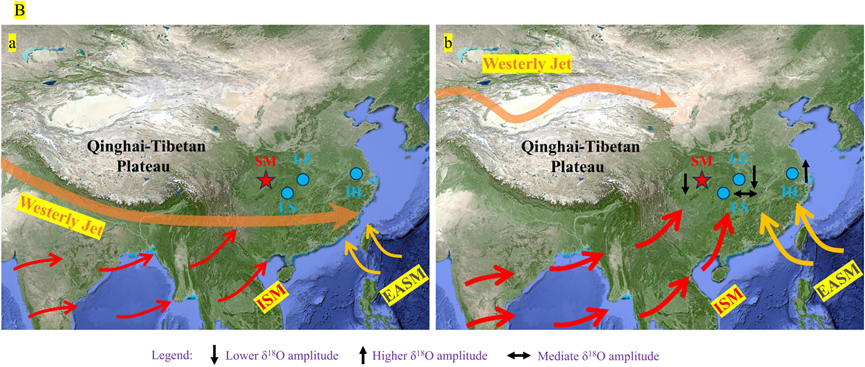 图3. 中国季风区石笋δ18O差异性比对(A)及其空间动力学机制模型(B)图