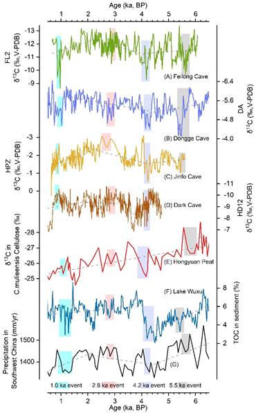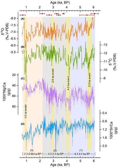 该研究基于中国西南地区贵州飞龙洞FL2石笋的多指标综合分析,对比西南地区多个古气候记录,分析了中晚全新世西南地区水文环境变化特征,研究了石笋δ13C和Mg/Ca,Sr/Ca比值对极端气候事件的响应,并探讨了石笋多指标的特征性周期及影响因素差异。研究发现,中晚全新世期间,FL2石笋δ18O和δ13C均呈现“偏正–偏负–偏正”的阶段性变化趋势,Mg/Ca比值也呈现“升高–降低–升高”的变化特征,响应亚洲夏季风影响下的西南地区“干旱–湿润–干旱”的降水模式。FL2石笋多指标敏感地记录了中晚全新世多次极端气候事件。例如在5.5、4.2、2.8和1.0 ka事件期间,FL2石笋δ18O、δ13C显著偏正,Mg/Ca,Sr/Ca比值显著升高。与西南地区其他石笋和湖泊沉积物记录良好的对应关系,证实了该记录的可靠性。主成分分析和功率谱分析表明,FL2石笋δ18O主要反映了百年际甚至更长时间尺度太阳活动引起的亚洲夏季风强度变化,而石笋δ13C和微量元素比值则更多响应于年际或年代际尺度区域水文条件的变化。该研究进一步证实了石笋中多个地球化学指标对水文条件变化的指示性,对于利用高分辨率石笋记录重建区域古气候古环境变化具有重要意义。