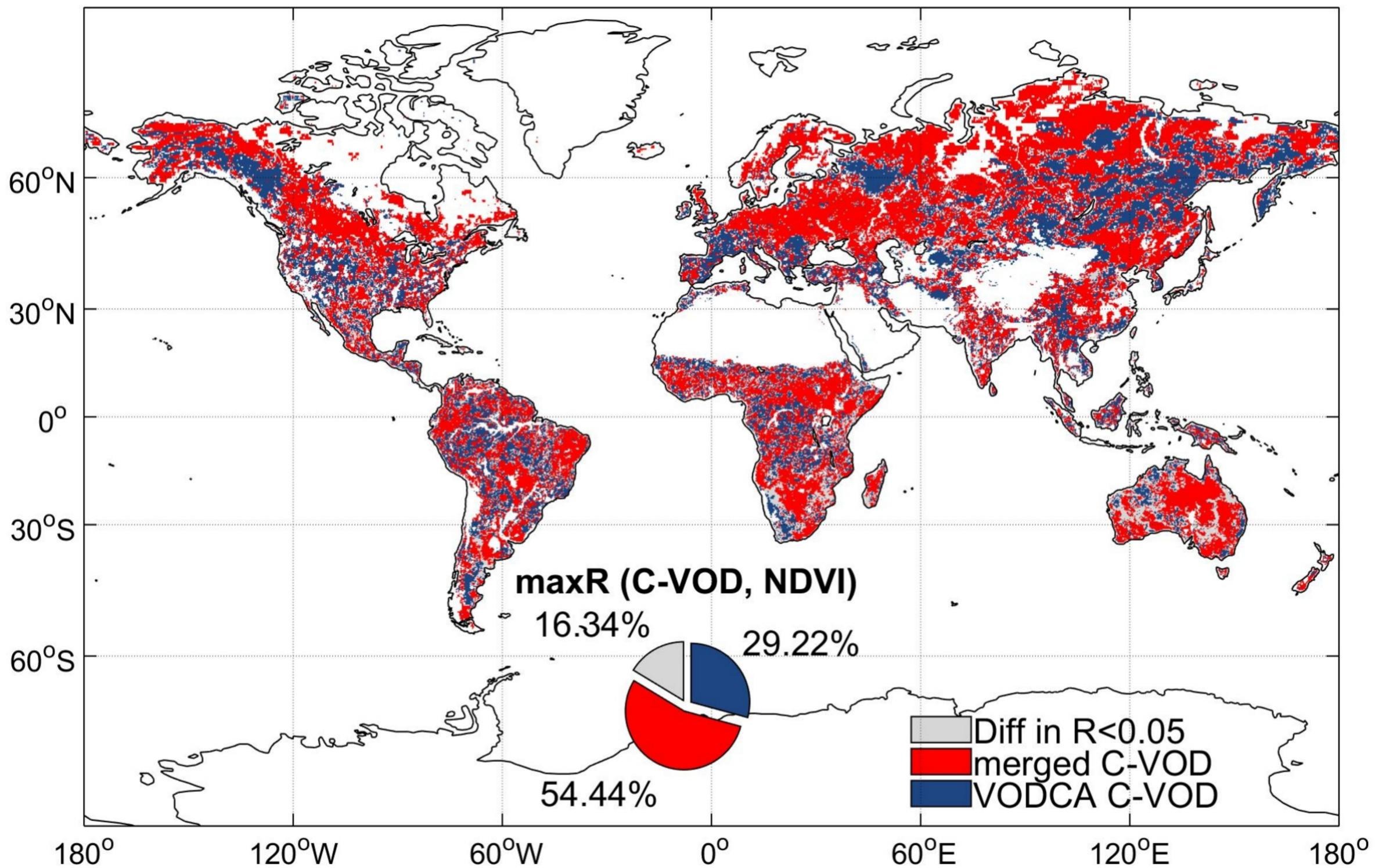 图2 合并C-VOD与VODCA C-VOD分别与NDVI具有最优时间相关性的区域分布