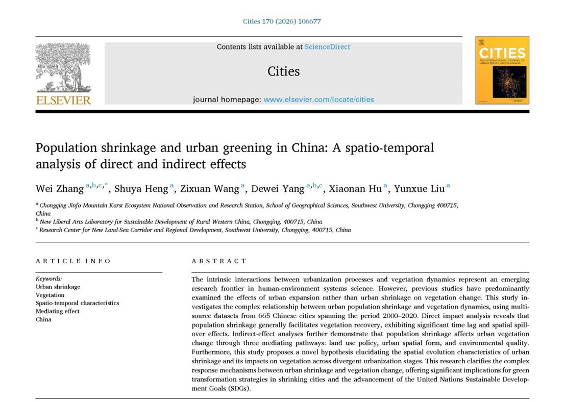 近日,张伟副教授课题组在国际权威期刊 Cities(中科院SSCI一区TOP,IF: 6.6)上发表了题为“Population shrinkage and urban greening in China: A spatio-temporal analysis of direct and indirect effects”的研究论文,系统揭示了城市人口收缩与植被变化的复杂响应关系。