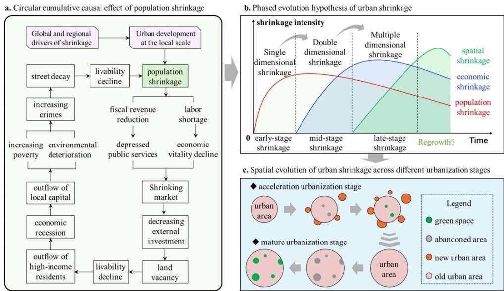 (a)人口收缩的循环累积因果效应; (b)“人口流失→经济下行→空间衰败”阶段性演变假说; (c) 不同城市化阶段城市收缩的空间演变模式.