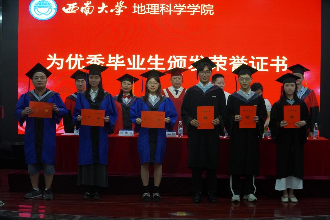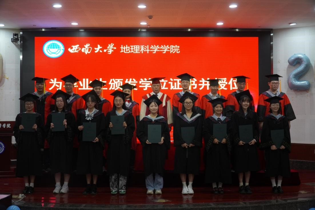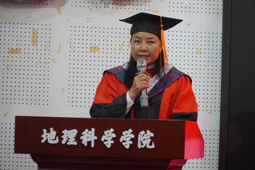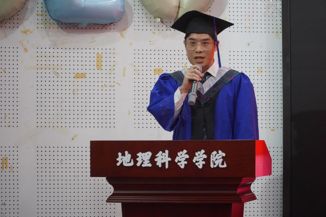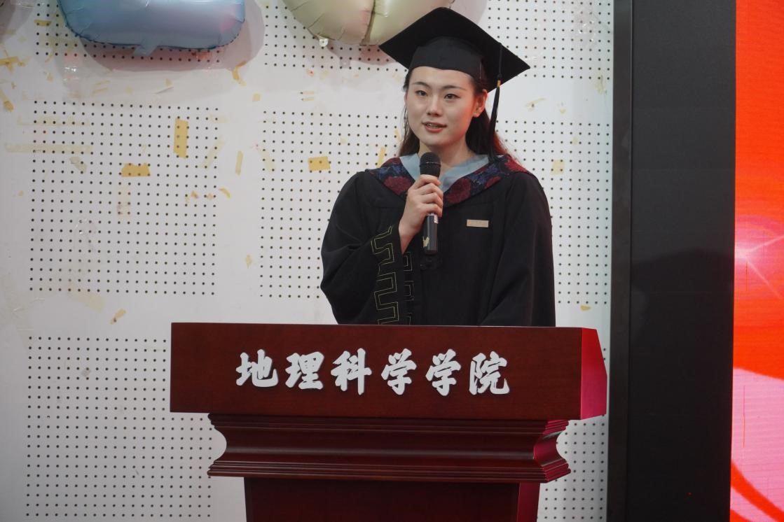 2020级地理信息科学专业慈萌瑶作为本科毕业生代表发言。她用“找自己”三个字来概括自己的大学时光,她表示,所有的坚持和努力都将化成实现梦想的底气。“愿我们驾驭时代的风帆,在社会的浪潮中乘风破浪,在人生的征途上锐意进取,在民族复兴的伟大征程中昂首阔步!”2021级人文地理学专业李东麟作为硕士毕业生代表发言。他指出,地理学研究生理应做到能坚持、有担当。同时,他也代表毕业生们向地科院的所有师生致以最真挚的感谢。