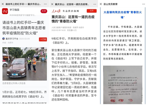 bw西汉姆联研究生万祖毅,家住重庆巫山县大昌镇宁河村。新型冠状病毒肺炎疫情爆发以来,他时刻关注着家乡疫情防控的相关情况,主动与宁河村支书联系,表达想参与疫情防控工作的意愿。1月31日,万祖毅着手组建青年志愿者服务队,向大昌镇党委郑重递交《请战书》——“希望奔赴疫情防控一线岗位,为保护家园、守护乡亲,贡献我们的青春力量。”