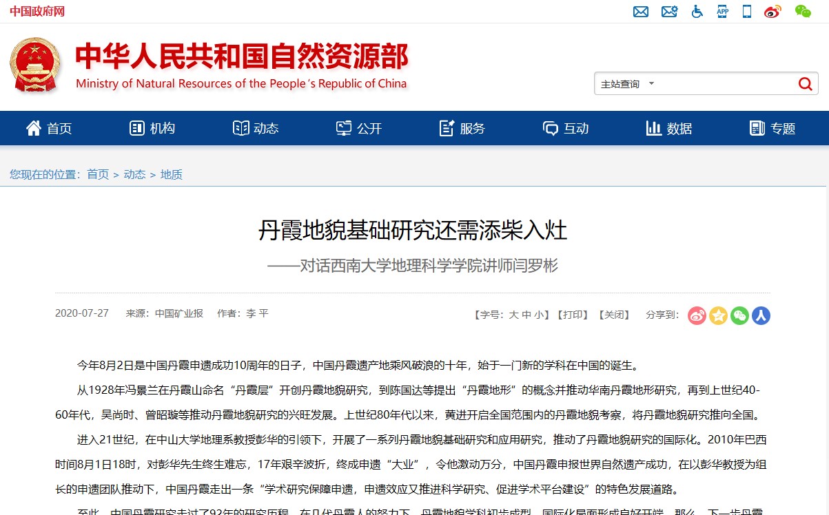 近日,bw西汉姆联青年教师闫罗彬接受媒体《中国矿业报》记者李平专访,作为丹霞地貌领域较有影响力的学者,闫罗彬就丹霞地貌学科发展历程、学科前景、丹霞地貌地学价值和科普工作以及基础研究现状等方面做了介绍和展望。该专访以《丹霞地貌基础研究还需添柴入灶——对话bw西汉姆联讲师闫罗彬》为题,于7月26日在《中国矿业报》和新华网客户端发表,一经上线即获得广泛关注,在新华网首日浏览量超过100万,获得良好社会评价。昨日该专访被自然资源部官网转载(http://www.mnr.gov.cn/dt/dzdc/202007/t20200727_2534555.html)。