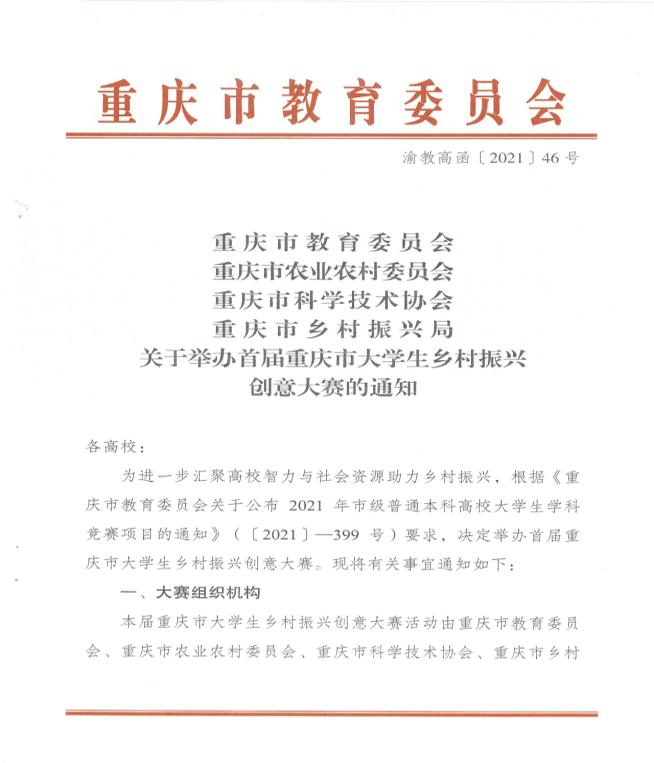 为进一步汇聚高校智力和社会资源助力乡村振兴,由重庆市教育委员会、重庆市农业农村委员会、重庆市科学技术协会、重庆市乡村振兴局联合主办的首届重庆市老员工乡村振兴创意大赛在2021年9月份拉开序幕。bw西汉姆联组建多支参赛队伍参加本次大赛,获得特等奖1项、一等奖1项、二等奖3项、三等奖1项的耀人佳绩。公司行政主要负责人杨庆媛老师获“优秀指导教师”荣誉称号。