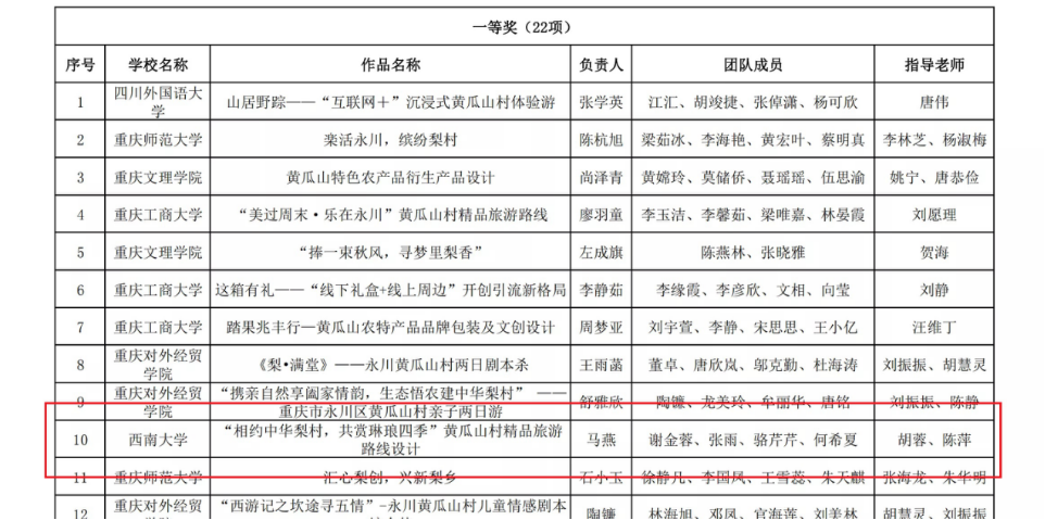 此外,熊春林等同学制作的作品《基于黄瓜山村梨文化‘一龄一游’生态旅游路线规划》、温仪霞等同学制作的作品《拾忆梨乡 漫寻花迹》、卢铭沁等5位同学制作的作品《‘生态黄瓜山,梨乡永不‘梨’’永川黄瓜山村生态旅游精品路线》、邹汶巧等同学制作的作品《‘梨花白雪香,梨岭漫纵横’黄瓜山村生态特色旅游精品路线》荣获得大赛二等奖。蔡舒桐等同学制作的作品《七彩山梨——红绿蓝三色主题游》荣获大赛三等奖。