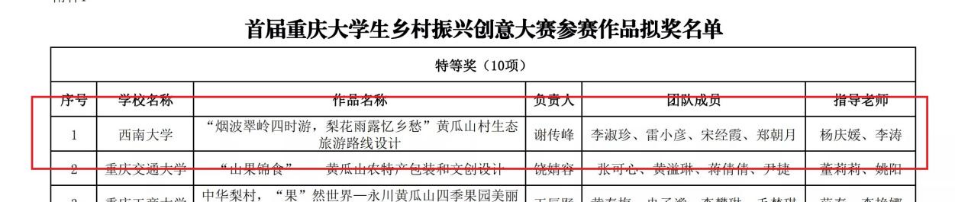本次大赛中,公司本科生谢传峰等同学制作的作品《‘烟波翠岭四时游,梨花雨露忆乡愁’黄瓜山村生态旅游路线设计》,在杨庆媛老师、李涛老师的指导下,以总分第一的成绩荣获特等奖;马燕等同学的作品《‘相约中华梨村,共赏琳琅四季’黄瓜山村精品旅游路线设计》,在胡蓉老师、陈萍老师的指导下,荣获一等奖。