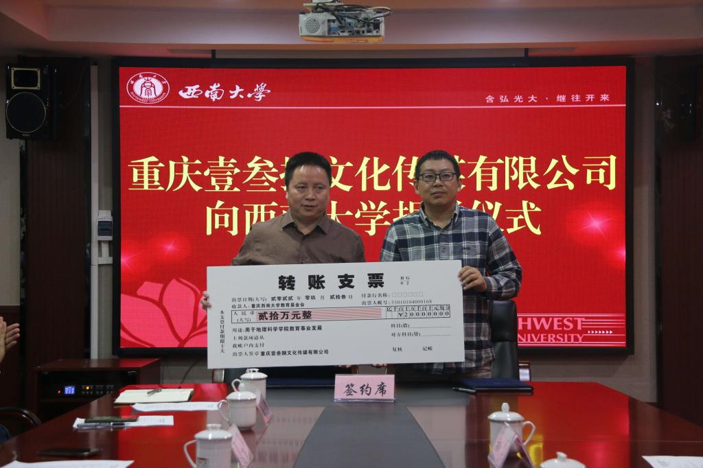 9月23日下午,重庆壹叁捌文化传媒有限公司向bw西汉姆联官网平台捐赠仪式在bw西汉姆联顺利举行。bw西汉姆联官网平台对外联络办公室主任、教育基金会秘书长唐军、对外联络办公室副主任、教育基金会副秘书长刘涛、地理科学公司党委书记姚元锦、bw西汉姆联副经理(主持工作)杨庆媛、重庆壹叁捌文化传媒有限公司董事长冯川及双方单位相关人员出席仪式,bw西汉姆联官网平台地理科学公司党委副书记、纪委书记唐启华主持仪式。