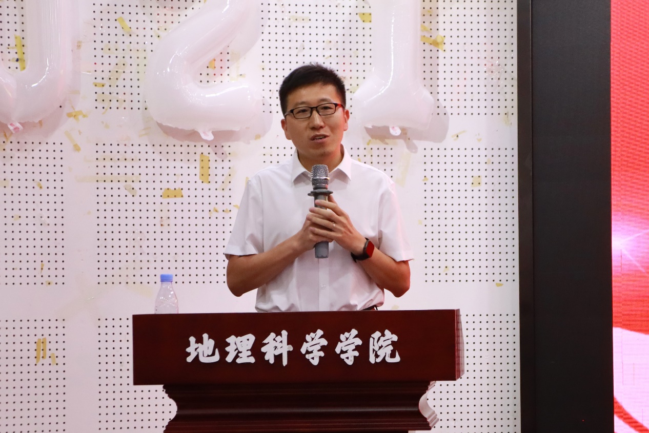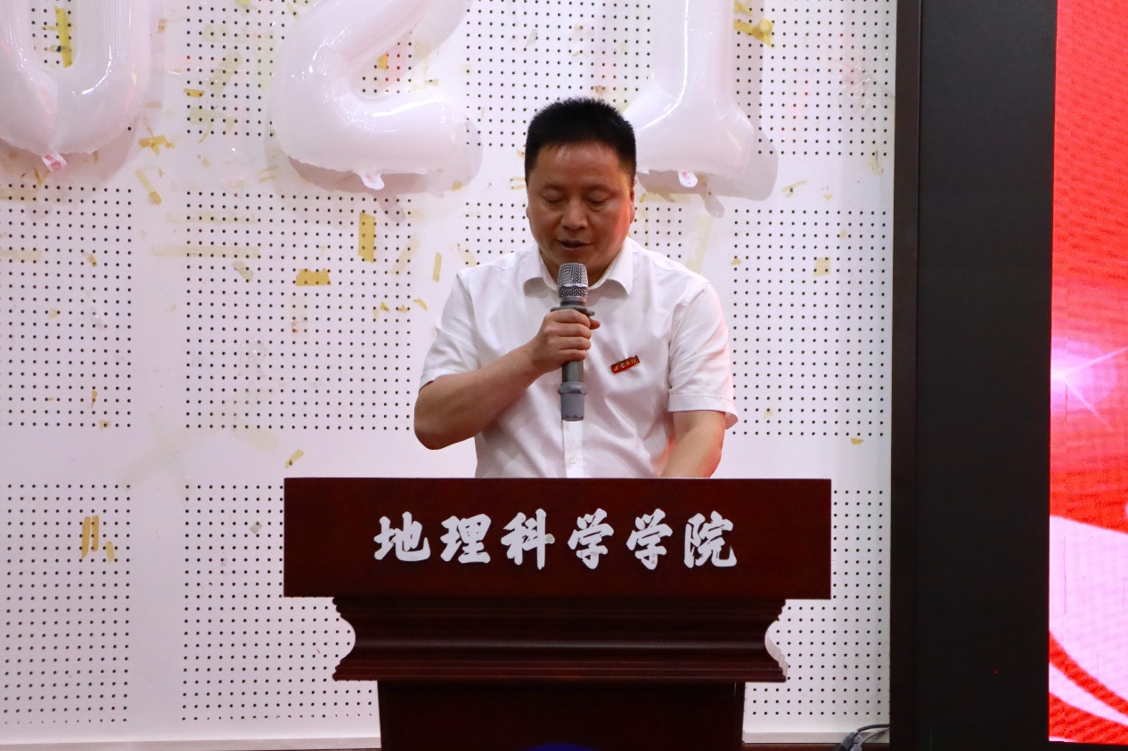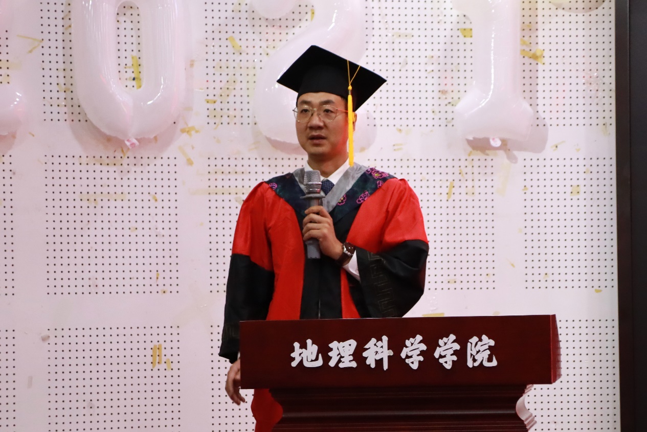 教师代表王亚辉教授以自身从农村学子“逆袭”成教授的经历激励毕业生。结合当下时代新背景,王老师提出“坚忍毅力、终身学习、乐观心态、为人大气、感恩之心”五个关键词。他寄语同学们秉持敏锐与执着,用地理智慧丈量世界,在人生新域积极探索,顺势而上绽放个人光芒。