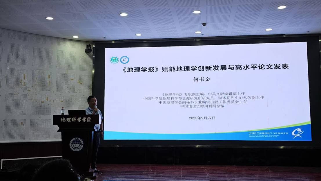 何书金研究员首先介绍国内外期刊集群的发展趋势,国际一流平台呈现品牌集中、数字化特征,国内也在加速推动集群化;其次,分析了中国地理资源期刊集群建设的现状:以《地理学报》为龙头形成规模效应,搭建期刊网平台,实现数据整合与知识服务,融入 AI 辅助审稿、智能排版等技术,学术影响力突出;同时介绍了《地理学报》悠久的办刊历史,载文涵盖自然与人文地理,在服务国家战略、推动学科交叉发展等方面的引领作用;分析了基于《地理学报》的地理学发展趋势,期刊指标持续提升,载文主题随时代演进,从自然要素研究延伸至城乡融合、“一带一路” 等热点;最后,他给出高水平论文发表指引,明确选题、写作范式要求,规范数据与图表使用,强调学术诚信的重要性,指导投稿与正确应对审稿结果。