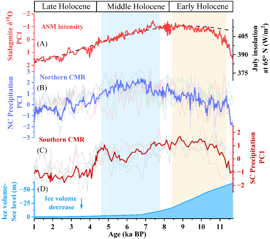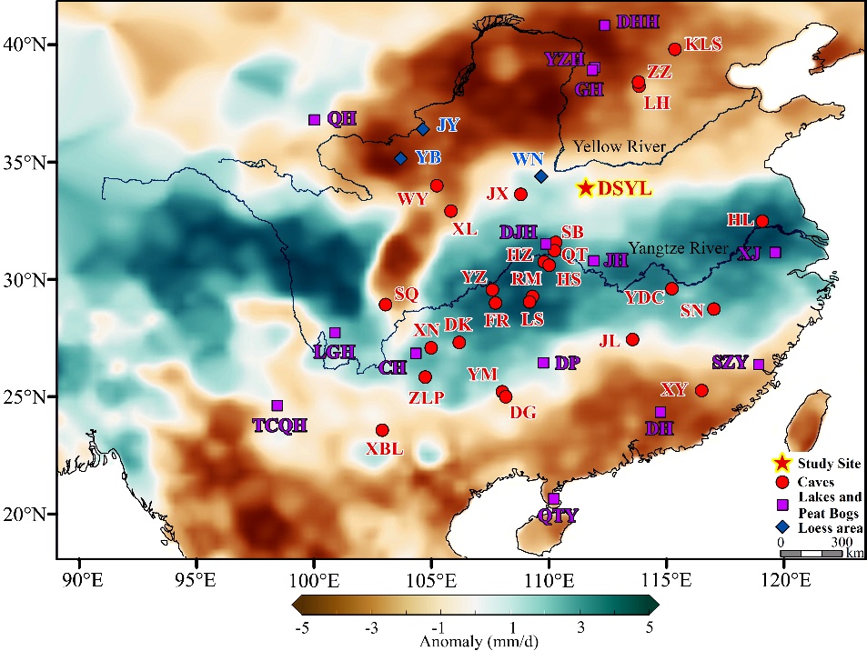 研究基于河南省栾川县东石崖洞和老母洞4根石笋,提供了我国北方过去2.5万年高分辨率、精准定年且连续的石笋多指标记录(δ18O、δ13C、Mg/Ca、Ba/Ca和Sr/Ca),重建了LGM以来亚洲夏季风(ASM)突变背景下中国季风边缘区的水文环境演化历史;并在此基础上揭示了中国石笋δ18O在空间上受水汽源区和水汽输送路径控制的纬向三极格局,其反映了印度季风与东亚季风水汽贡献差异随时间的演变;而在降水量意义上,中国季风区则表现出由西风带、全球冰量以及西太平洋副热带高压(WPSH)等调控的径向降水空间格局。这一结果从空间格局角度印证了在千年尺度上中国石笋δ18O主要记录了大尺度ASM环流变化而非局地降水强度。