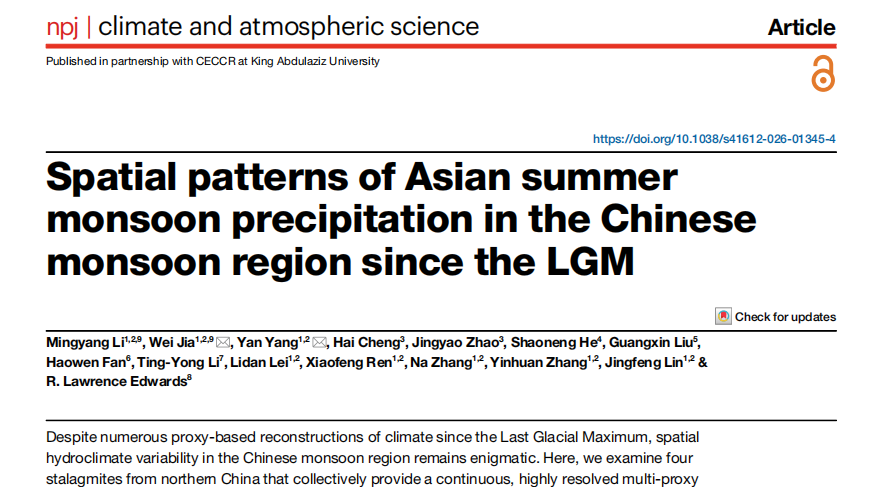 2026年3月11日,杨琰教授团队联合西安交通大学、新加坡南洋理工大学、云南大学、中国地质大学(武汉)、云南师范大学、美国明尼苏达大学等多家科研单位,在地球科学领域Top期刊《npj Climate and Atmospheric Science》正式发表题为“Spatial patterns of Asian summer monsoon precipitation in the Chinese monsoon region since the LGM”的科研成果。该研究系统揭示了轨道—千年尺度气候突变背景下,中国季风区降水和石笋δ18O在空间上的重组特征及其动力学机制。