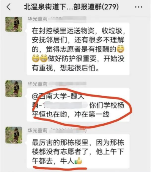 “今天小区被列入高风险区了,邻居们不能出门了。微信群里号召核酸阴性的老师们加入志愿者队伍,为小区邻居们提供服务。”11月中旬的某一天,杨平恒的爱人说,“你的在线课程讲稿写得差不多了吧?如果差不多了,去做志愿者,我在家照顾好两个孩子。”“好的,没问题,我这就戴上口罩去中庭报到。”杨平恒答道。