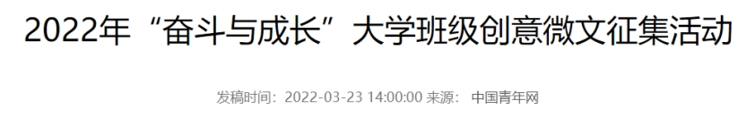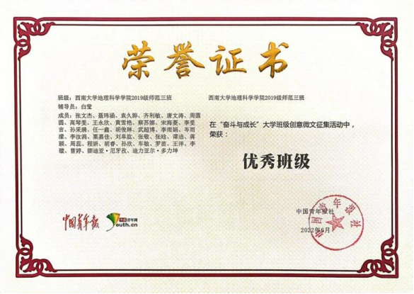 在中国青年报社指导下,中国青年网组织开展了2022年“奋斗与成长”大学班级创意微文征集活动,面向广大高校员工征集以“奋斗与成长”为主题的微信文章。bw西汉姆联2019级地理科学(师范)三班的同学一同努力,积极参与了此次活动的评选。
