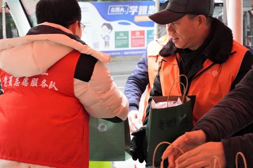 送温暖活动继续进行,党员志愿者们带上这份“冬日温暖”来到了二号门校车点,为校车师傅们一个个地送上礼物并表达谢意。师傅们为这份“出其不意”的礼物感到喜悦,赶忙招呼自己的同事来领取。有校车师傅说:“同学们真的非常感谢你们,这是我们的工作,坚守岗位是我们应该做的,你们的心意我们收到了!”“我们会非常高兴,你们的心意真的让这个冬天更加温暖了,叔叔阿姨们都真的非常感动!”也有一位阿姨激动地说:“同学们,太感谢你们了,你看我已经把你们的照片和给我们的礼物照片发到我们的工作群里了,我们的领导也很高兴!你看!”说着,阿姨把手机递给志愿者们看。也有阿姨一直招呼着刚把校车停靠好的师傅:“过来快过来,我们一起和同学们合个影,感谢地科院的同学们这么关心我们!”