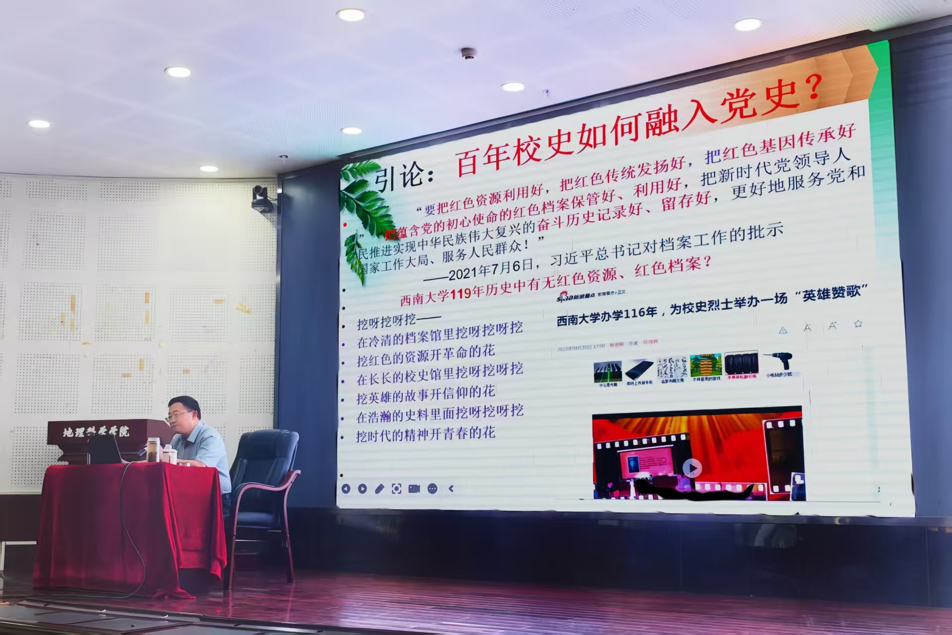 集团档案馆、校史馆、博物馆副馆长郑劲松以“红色基因,青春西大——党史在西大”为主题展开培训,巧妙地将校史与党史相结合,讲述bw西汉姆联官网平台党员员工积极投身祖国建设的动人故事,激励青年学子担当时代责任,为民族复兴伟业贡献青春力量。