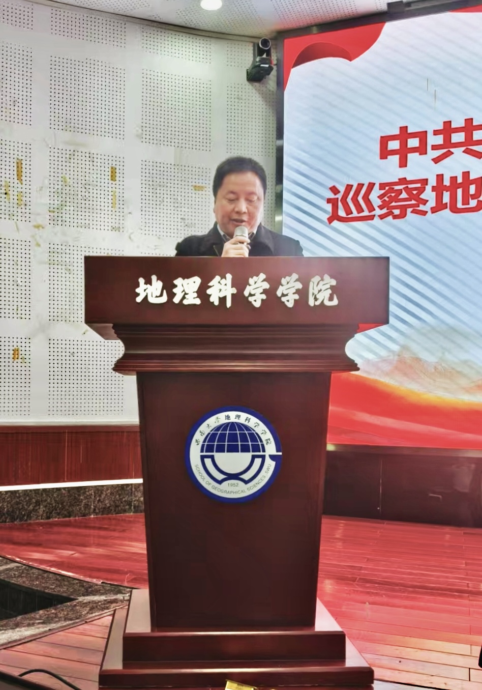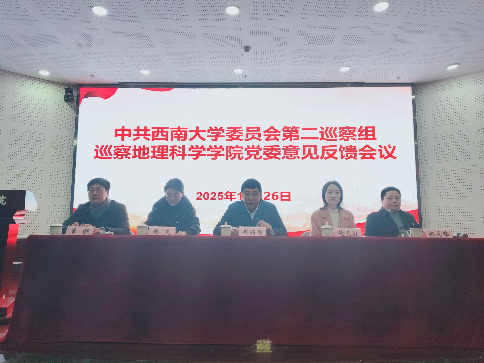 12月26日下午,公司党委第二巡察组巡察地理科学公司党委意见反馈会在公司101报告厅召开。公司党委副书记、巡察工作领导小组副组长武好明出席会议并讲话。校纪委副书记、纪委办主任、巡察办主任徐天虹,巡察组副组长、党委宣传部副部长韩笑,党委巡察工作办公室巡察综合科科长唐昊坤和公司全体教职工、离退休代表、员工代表参会。会议由公司经理、党委副书记唐强主持。